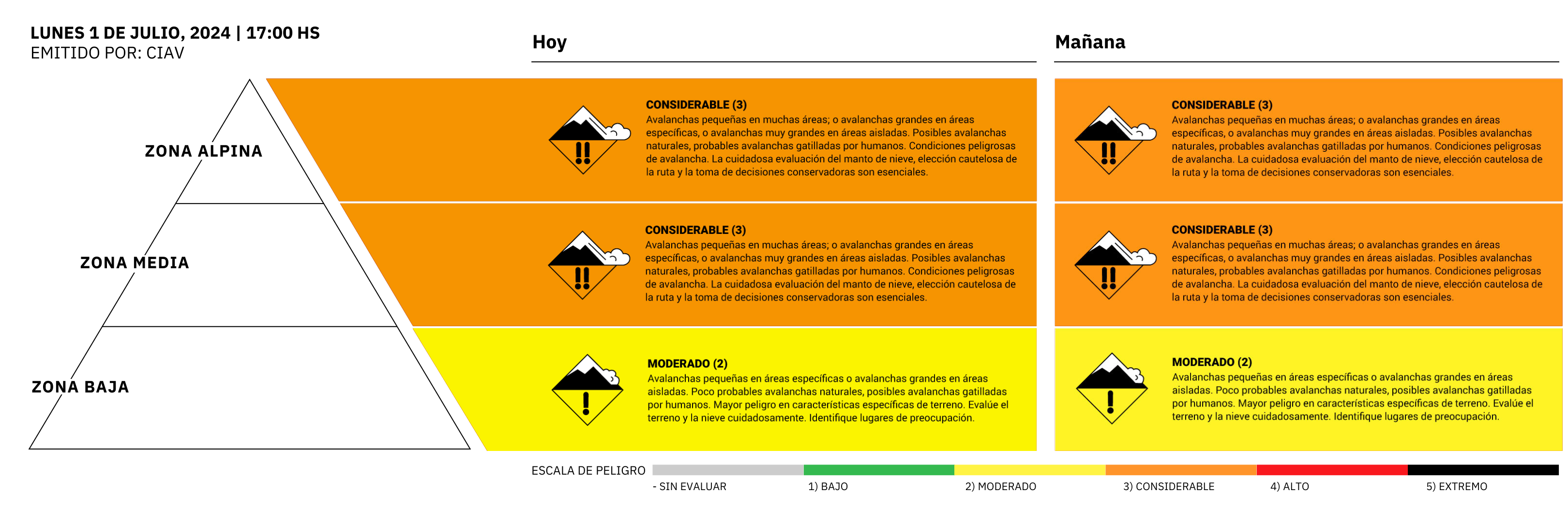 Para el día de mañana, martes 2, se estima que el peligro de avalanchas se mantenga o aumente. La confianza en esta estimación para mañana se considera baja.