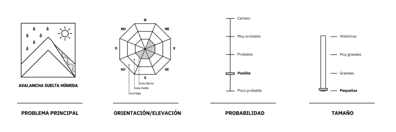 Posibles avalanchas chicas de nieve suelta húmeda en las orientaciones suroeste, sur, sureste, este y noreste de la zona alpina. Poco probables avalanchas en la zona media. La zona baja está sin manto suficiente para la ocurrencia de avalanchas.