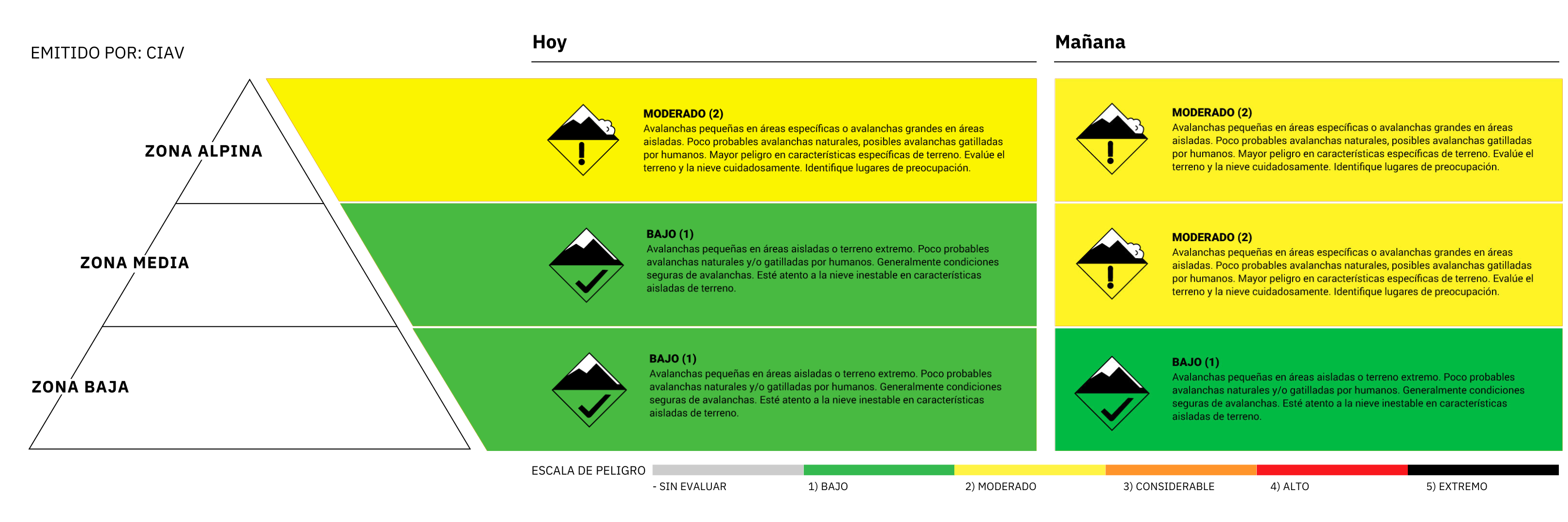 Para el día de mañana, lunes 12, se estima que el peligro de avalanchas en zona Alpina y zona Media sea Moderado (2) y en zona Baja sea Bajo (1). La confianza en esta estimación para mañana se considera baja.