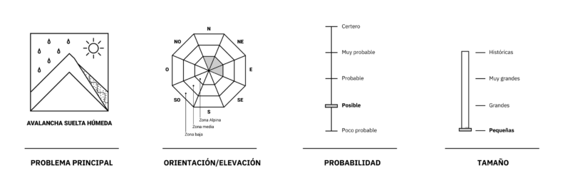 Posibles avalanchas chicas de nieve suelta húmeda en las orientaciones este, noreste y norte de la zona alpina. Poco probables avalanchas en la zona media y en la zona baja.