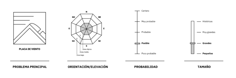 Probables avalanchas chicas y posibles avalanchas grandes de placa de viento en todas las orientaciones de la zona alpina. Poco probables avalanchas en la zona media y la zona baja.