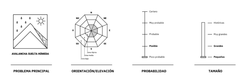 Estar atentos en pendientes muy pronunciadas, mayores o iguales a 35 grados de inclinación, cerca de los filos y de los obstáculos en la zona alta de la montaña, sobre todo si estas presentan trampas de terreno por debajo, como rocas todavía descubiertas, zonas confinadas y barrancos, donde incluso una avalancha pequeña podría tener consecuencias graves.