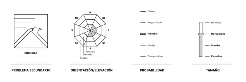 Muy probables avalanchas grandes y probables avalanchas muy grandes de placa de viento en orientaciones sur, sureste, este, noreste, norte y de carga cruzada de la zona alpina y la zona media. Probables avalanchas muy grandes de placa persistente en la zona alpina y media, en orientaciones suroeste, sur, sureste, este y noreste. Probable caída de cornisas muy grandes en la zona alpina. Posibles avalanchas grandes en la zona baja.