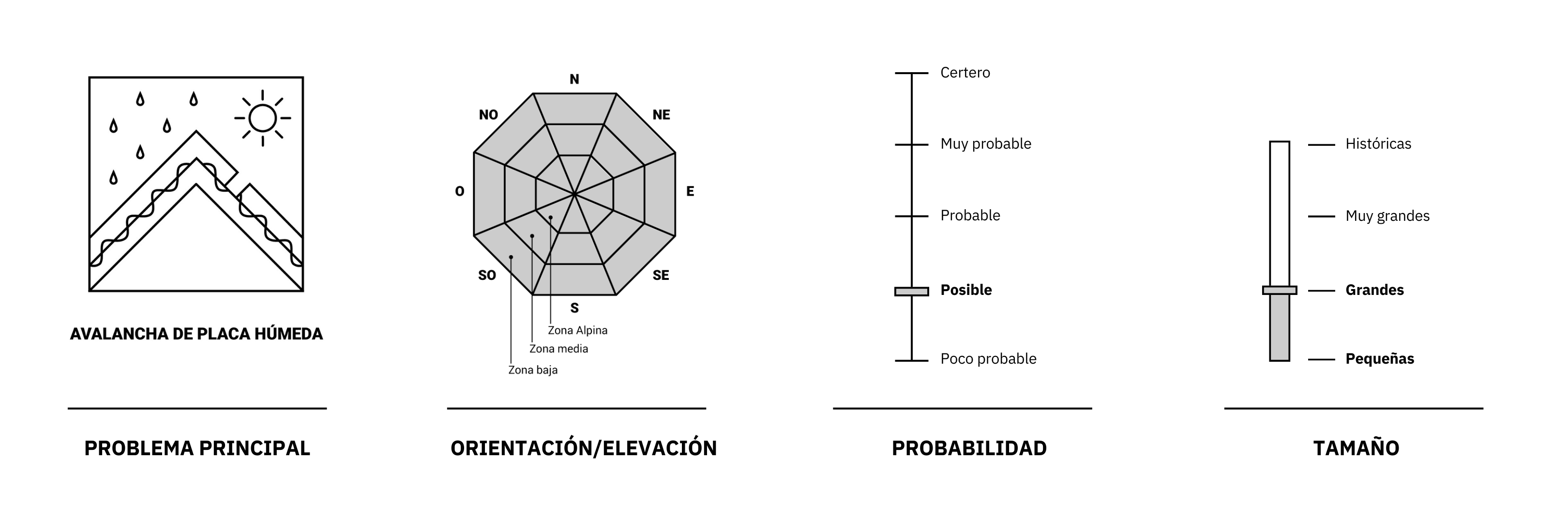 El incremento de la temperatura a partir del mediodía sugiere la posibilidad de que se desencadenen avalanchas, que pueden alcanzar tamaños grandes, en cualquiera de las tres bandas de altitud de la montaña. Este peligro puede llegar a ser mas marcado en las zonas baja y media, así como en orientaciones soleadas y terrenos empinados.