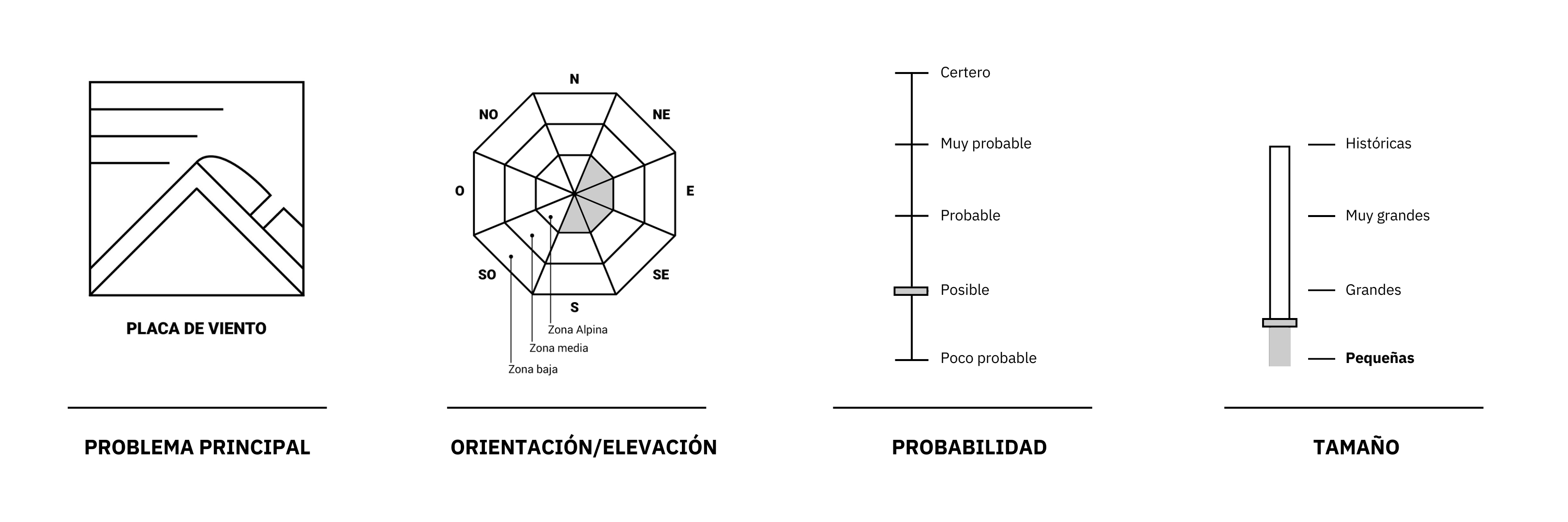 Se recomienda prestar atención a la acumulación reciente cerca de los filos en las orientaciones mencionadas en los Problemas de Avalanchas, especialmente en pendientes con una inclinación superior a 40º, cuando estas se encuentran por encima de áreas peligrosas como acantilados, depresiones o zonas confinadas, donde una avalancha podría tener consecuencias graves. Es importante evitar transitar sobre las cornisas, ya que podrían quebrarse bajo el peso de las personas.