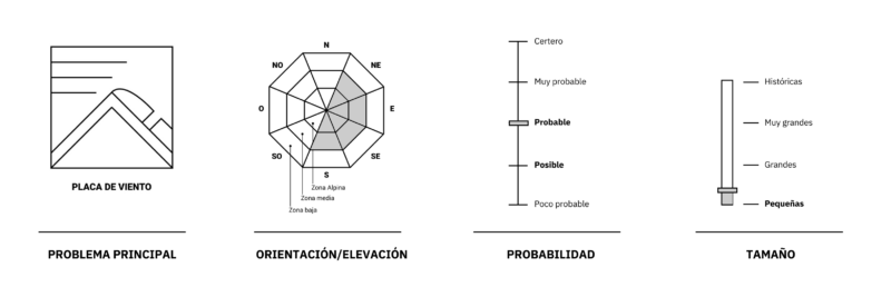 Avalanchas en terreno específico con pendientes igual o mayor a 35º. Con orientación sur al noreste por arriba de los 1300msnm. Y en sectores aislados con diversas orientaciones en zona media (sectores protegidos del viento, debajo de cornisas y dentro de concavidades
