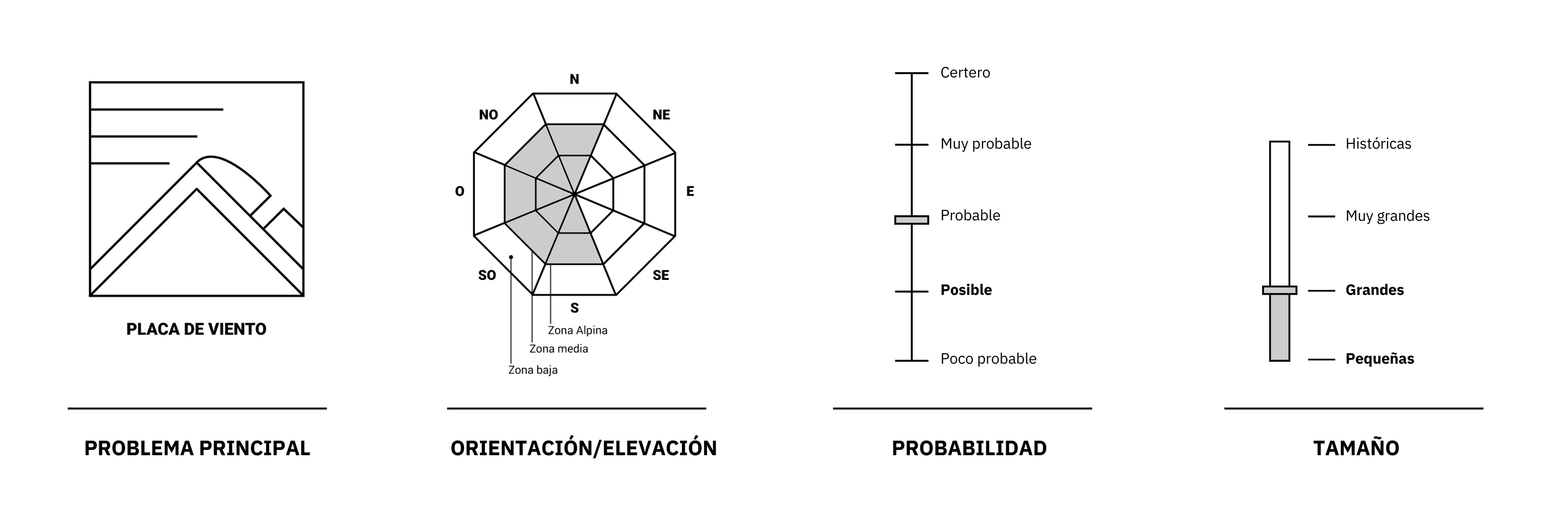 Probables avalanchas de placas de viento pequeñas a grandes en zona media y especialmente en zona alpina, en lugares específicos a sotavento de filos, lomos y otros obstáculos, en orientaciones norte, oeste y sur.
