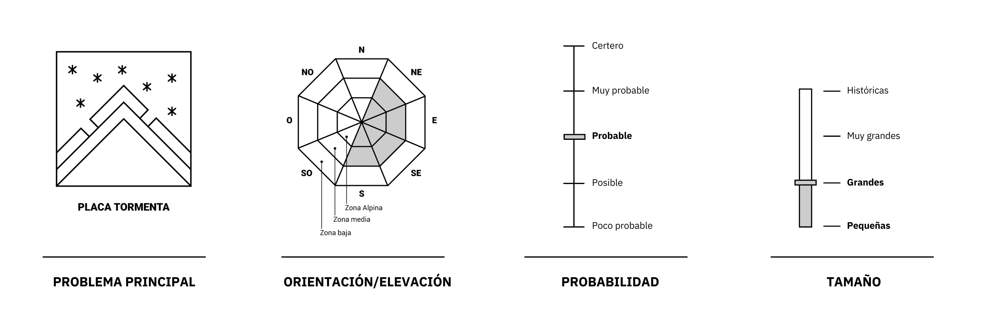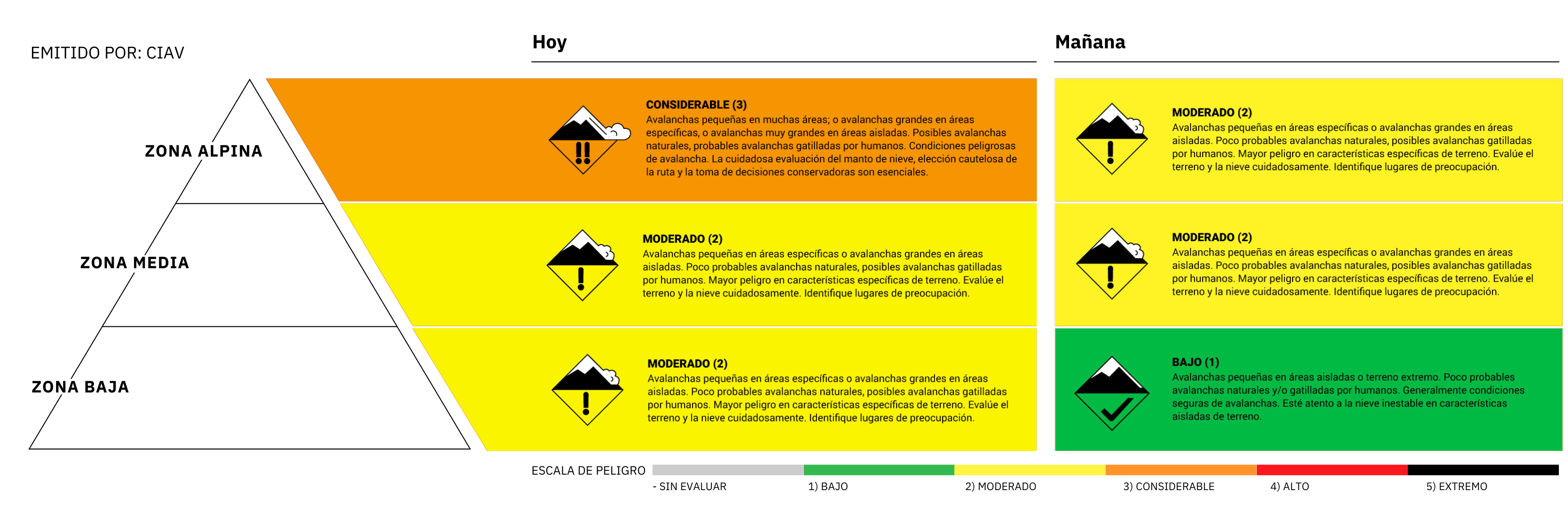 Probable avalanchas naturales y posibles avalanchas de Placa de Tormenta desencadenadas por personas en zona Alpina. Posibles avalanchas de Tormenta desencadenadas por personas en zona Media. Posibles avalanchas de Nieve Suelta Húmeda en zona Baja.