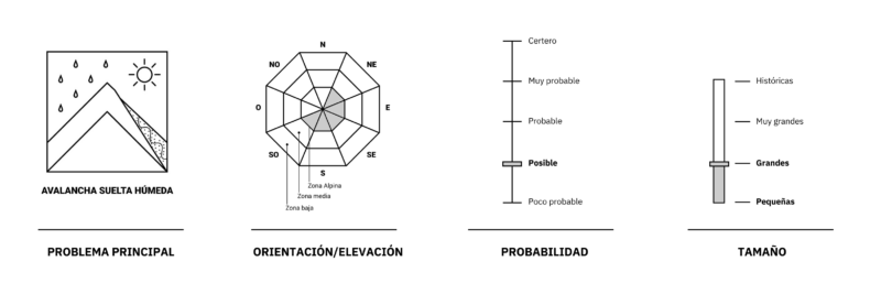 Probables avalanchas chicas y posibles avalanchas grandes de nieve suelta húmeda en las orientaciones suroeste, sur, sureste, este y noreste de la zona alpina. Posibles avalanchas chicas de nieve suelta húmeda en la zona media. La zona baja está sin manto suficiente para la ocurrencia de avalanchas.