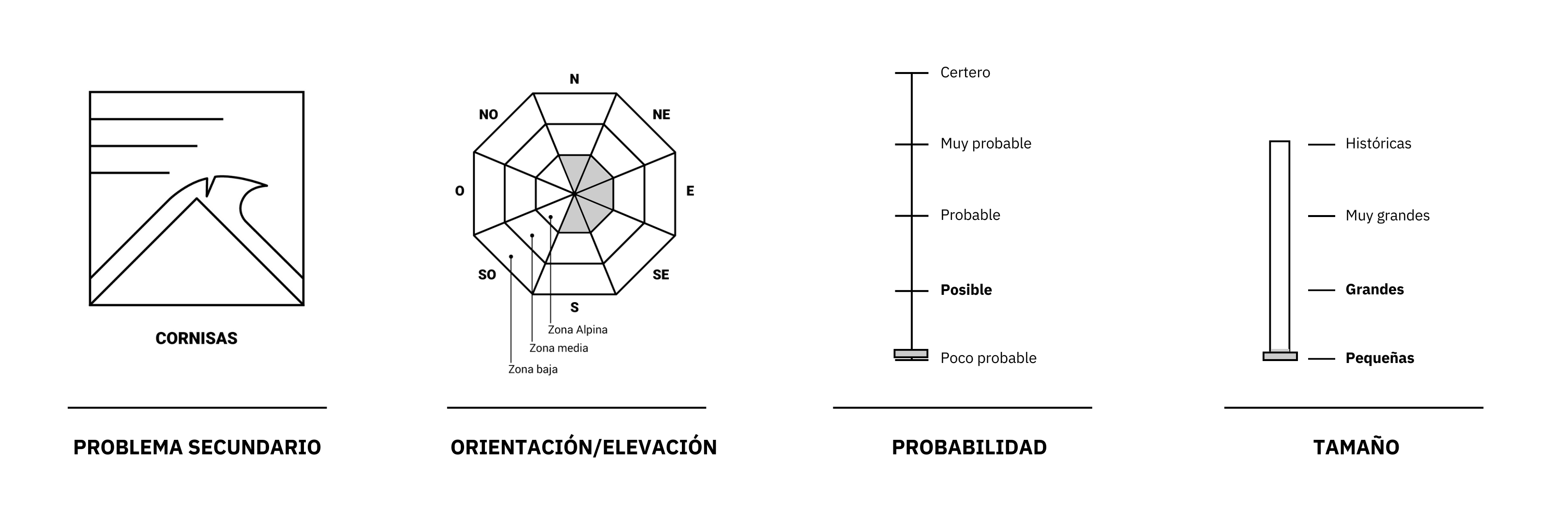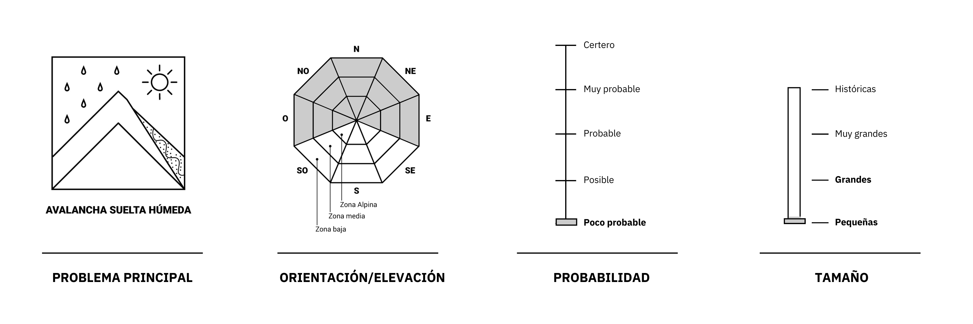 Poco problable avalanchas pequeñas de nieve Suelta Húmeda en todas las altitudes, de manera aisladas y en orientaciones este, noreste, norte, noroeste y oeste.