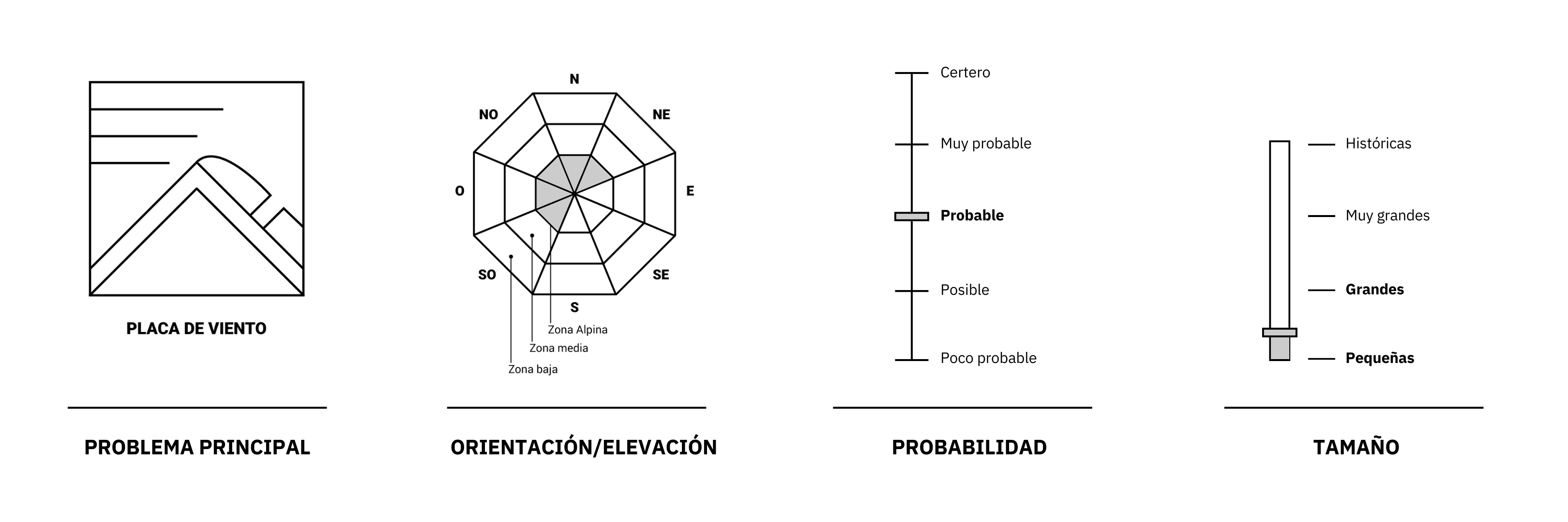 Probables avalanchas pequeñas en la zona Alpina en orientaciones noreste, norte, noroeste, oeste y suroeste. Posible avalanchas zona Media. Poco probable avalanchas en zona Baja.