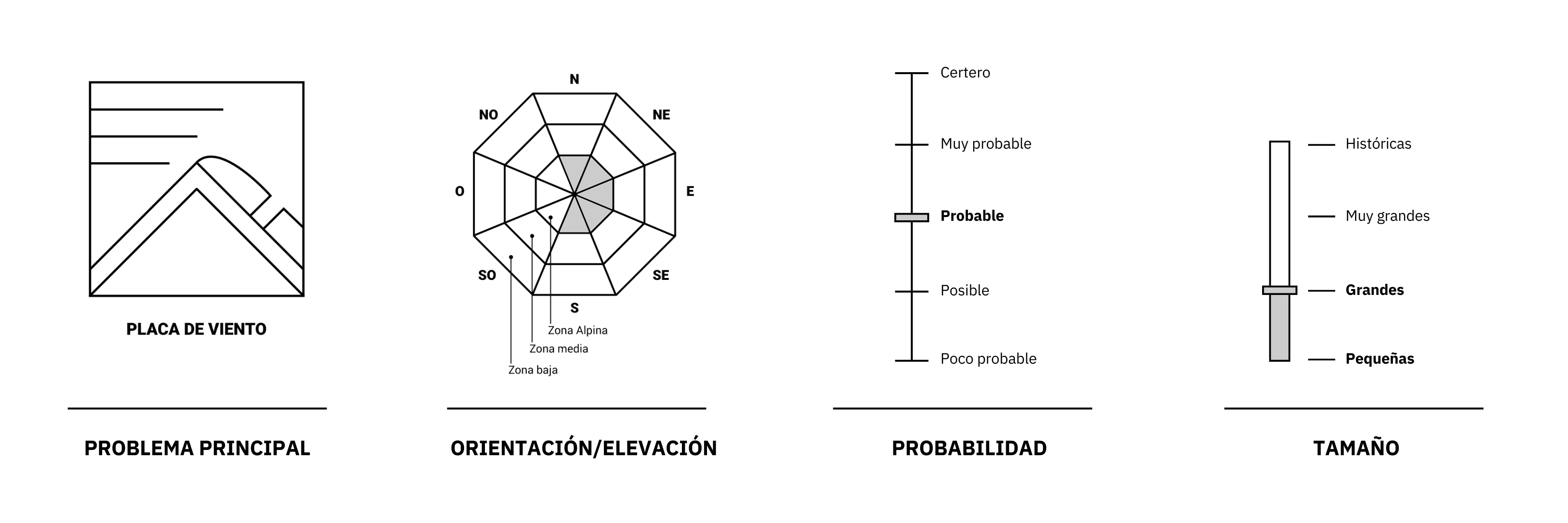 Placas de viento localizadas en pendientes con orientación sur al este, arriba de los 1400msnm y en sectores aislados en zonas media montaña con diversas orientaciones (sectores protegidos del viento, debajo de cornisas y dentro de concavidades