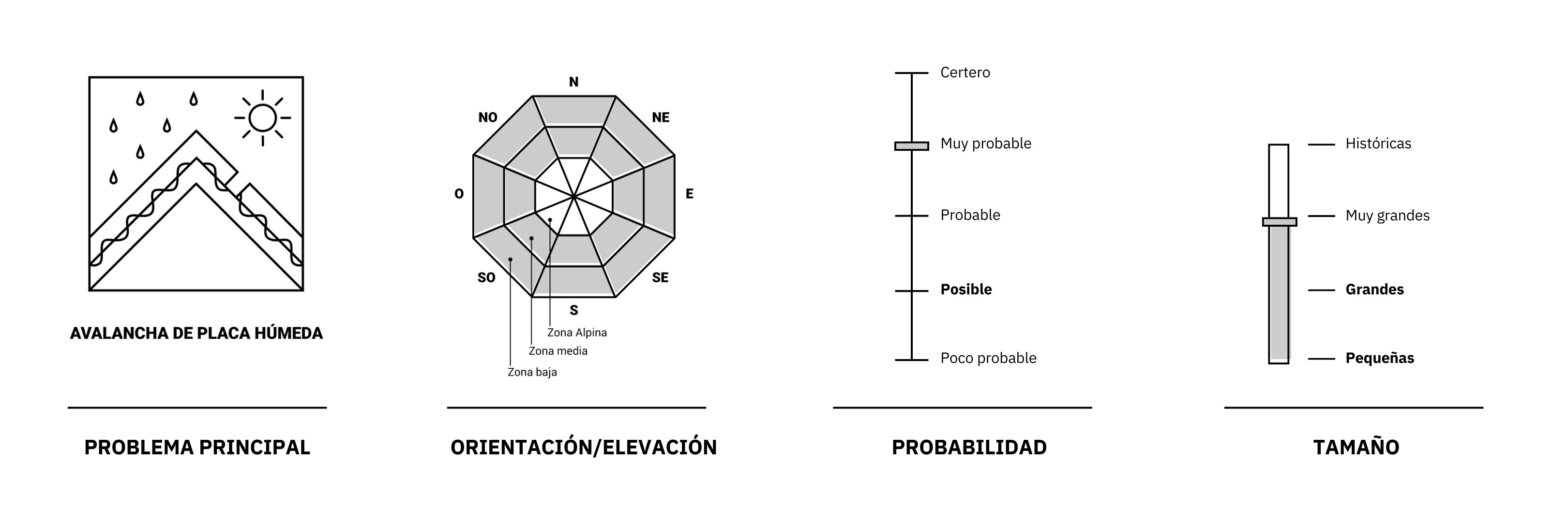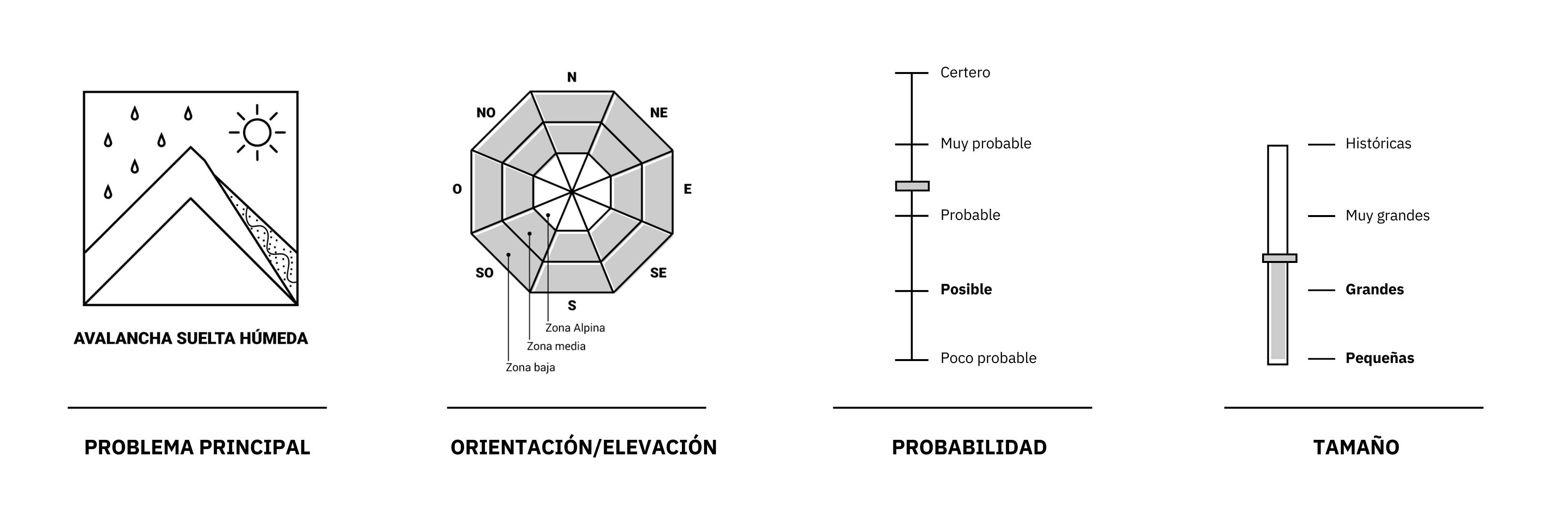 Avalanchas en terreno localizado en todas las orientaciones especialmente laderas expuestas al sol, por debajo de la cota 1200m.