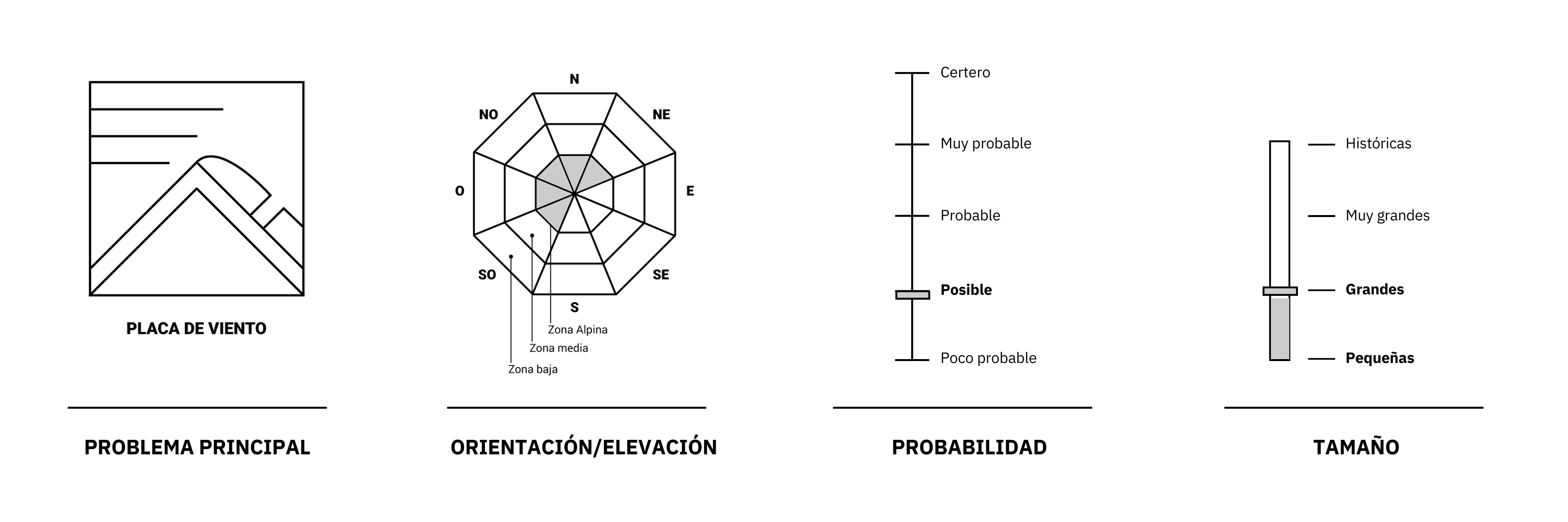 Posibles avalanchas grandes en la zona Alpina en orientaciones noreste, norte, noroeste, oeste y suroeste. Poco probable avalanchas zona Media y en zona Baja.