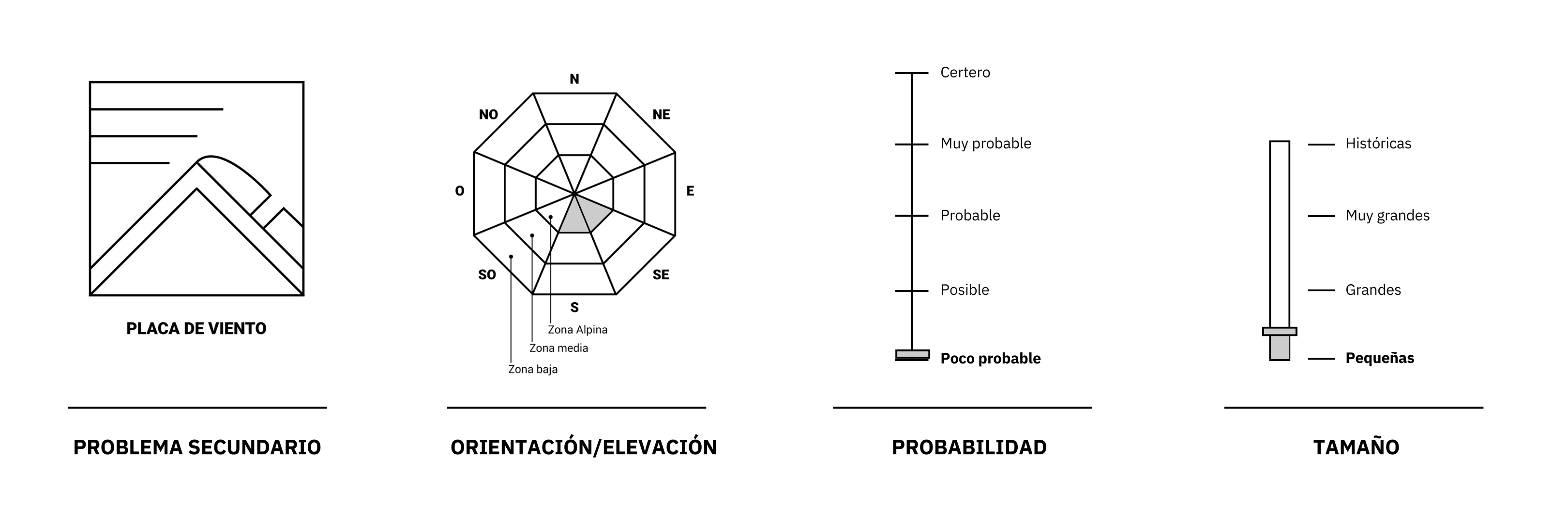 Los problemas de placa de viento se encuentran en la parte más alta de la zona alpina (en orientaciones sur y sureste), con una distribución aislada de tamaño pequeño y sensibilidad «terca» no reactiva.