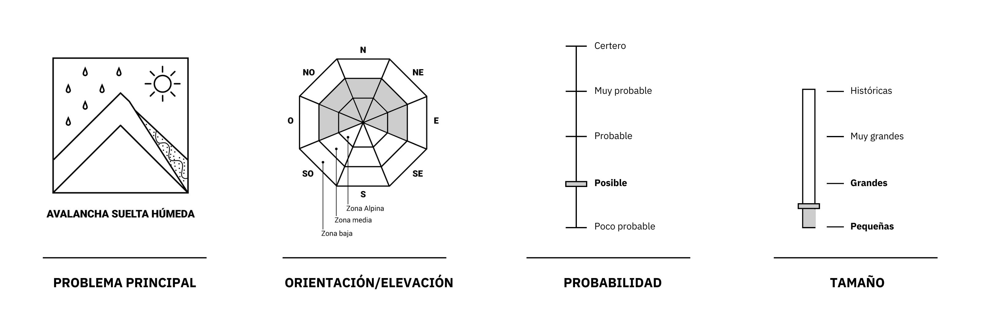 Posible avalanchas pequeñas de nieve suelta humeda en orientaciones noreste, este, norte, noroeste y oeste en laderas inclinadas mayores a 35º en zona alpina y zona media. Posibles caídas de cornisas desencadenadas por personas en la zona Alpina. Poco probable avalanchas de placa de viento desencadenadas por personas en áreas aisladas de la zona alpina, con orientaciones noreste, este, sureste y sur. Poco probables avalanchas en la zona Baja.