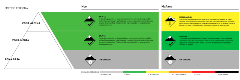 Para el día de mañana, miércoles 1 de octubre, se estima que el peligro de avalanchas en la zona alpina sea Moderado (2), en la zona media sea Bajo (1) y la zona baja esté sin manto suficiente para que ocurran avalanchas. La confianza en esta estimación para mañana se considera Baja.