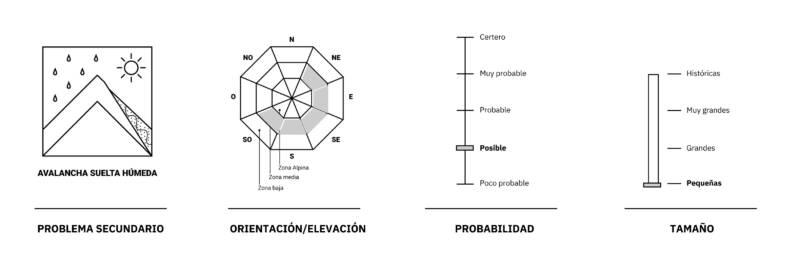 Probables avalanchas chicas y posibles avalanchas grandes de placa de viento en las orientaciones suroeste, sur, sureste, este, noreste y lugares de carga cruzada de la zona alpina. Posibles avalanchas chicas de nieve suelta húmeda en la zona media. La zona baja está sin manto suficiente para la ocurrencia de avalanchas.