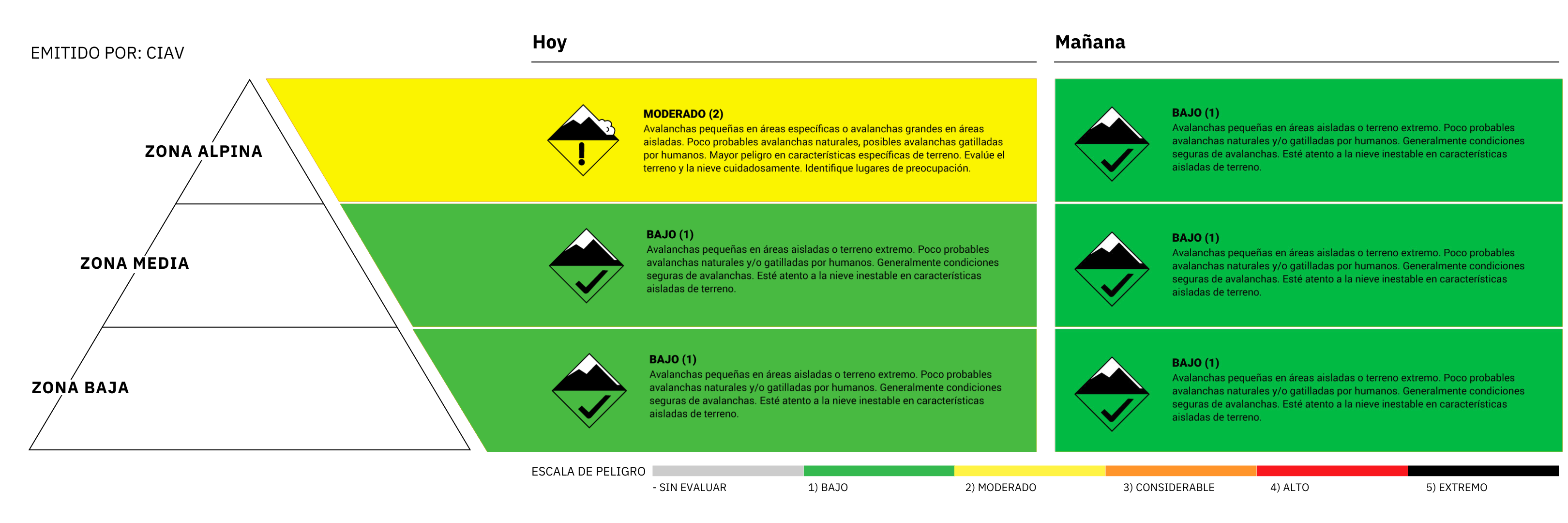 Para el día de mañana, miércoles 7, se estima que el peligro de avalanchas en zona Alpina, en zona Media y zona Baja sea Bajo (1). La confianza en esta estimación para mañana se considera media.