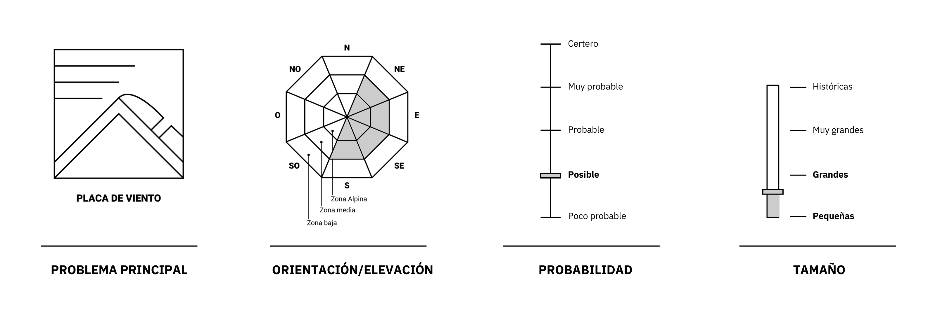 Se recomienda evitar lugares con evidente acumulación de nieve por viento, en terreno igual o mayor a 35 grados, especialmente en orientaciones noreste, este, sureste y sur de la zona alpina y zona media.