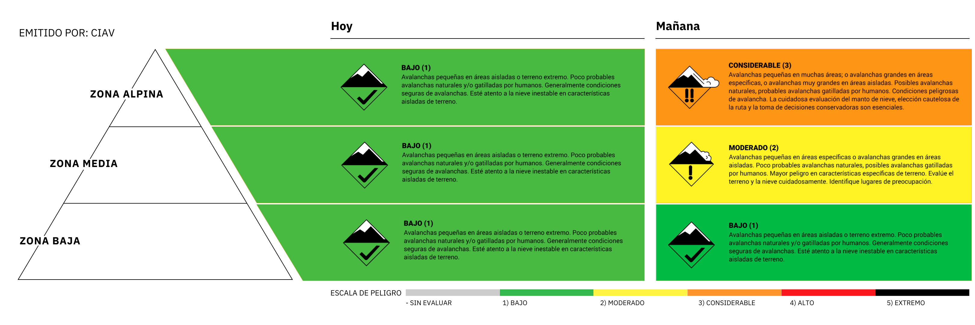 Para el día de mañana, jueves 25, se estima que el peligro de avalanchas en zona Alpina suba a considerable (3), zona Media a Moderado (2) y en zona Baja permanezca en Bajo (1). La confianza en esta estimación para mañana se considera baja.