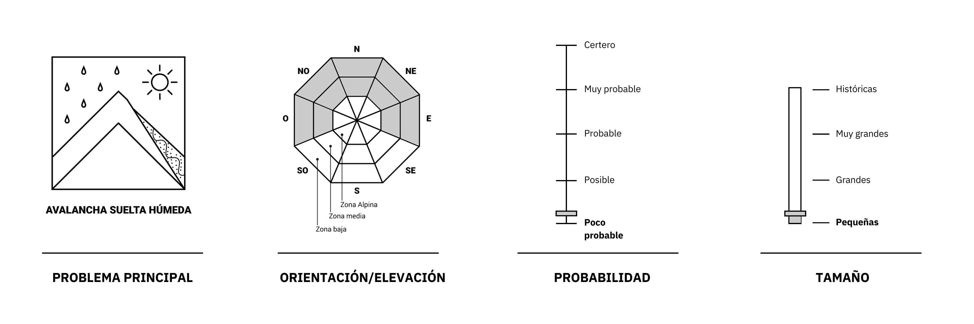 Poco probable pequeñas avalanchas de Nieve Suelta Húmeda en zona Media y zona Baja, en orientaciones este, noreste, norte, noroeste y oeste.