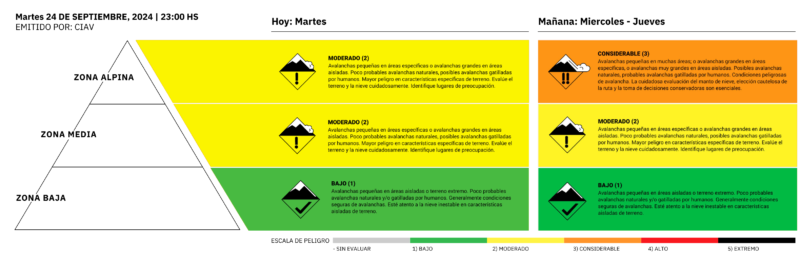 Avalanchas localizadas en pendientes con orientación sur al norte pasando por el este arriba de los 1300msnm y en sectores aislados con diversas orientaciones en zona media (sectores protegidos del viento, debajo de cornisas y dentro de concavidades