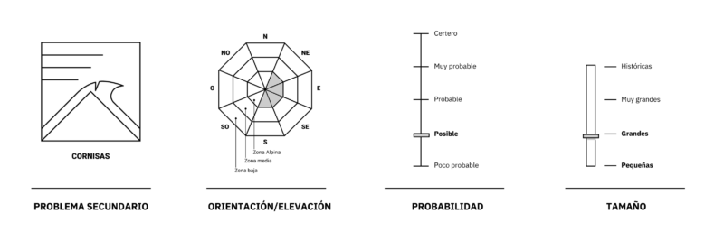 Posibles avalanchas grandes de placa de viento en las orientaciones suroeste, sur, sureste, este, noreste y norte de la zona Alpina y la zona Media. Poco probables avalanchas en la zona baja. Posible caída de cornisas grandes.