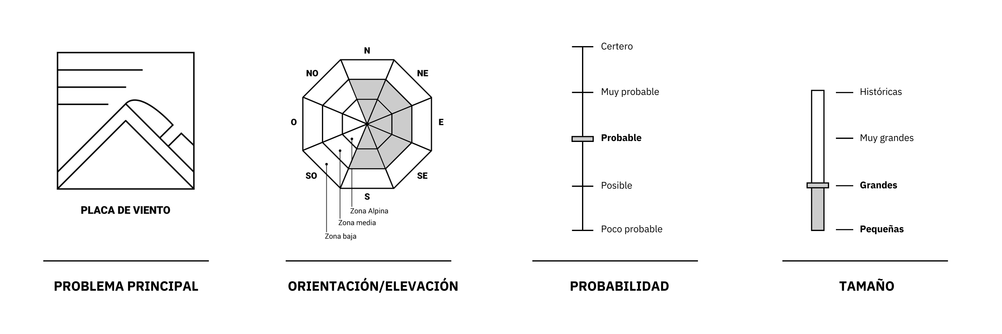 Probables avalanchas de placas de viento grandes en zonas alpina y media, en lugares especificos a sotavento de filos, lomos y otros obstáculos, especialmente en orientaciones norte, este, y sur.