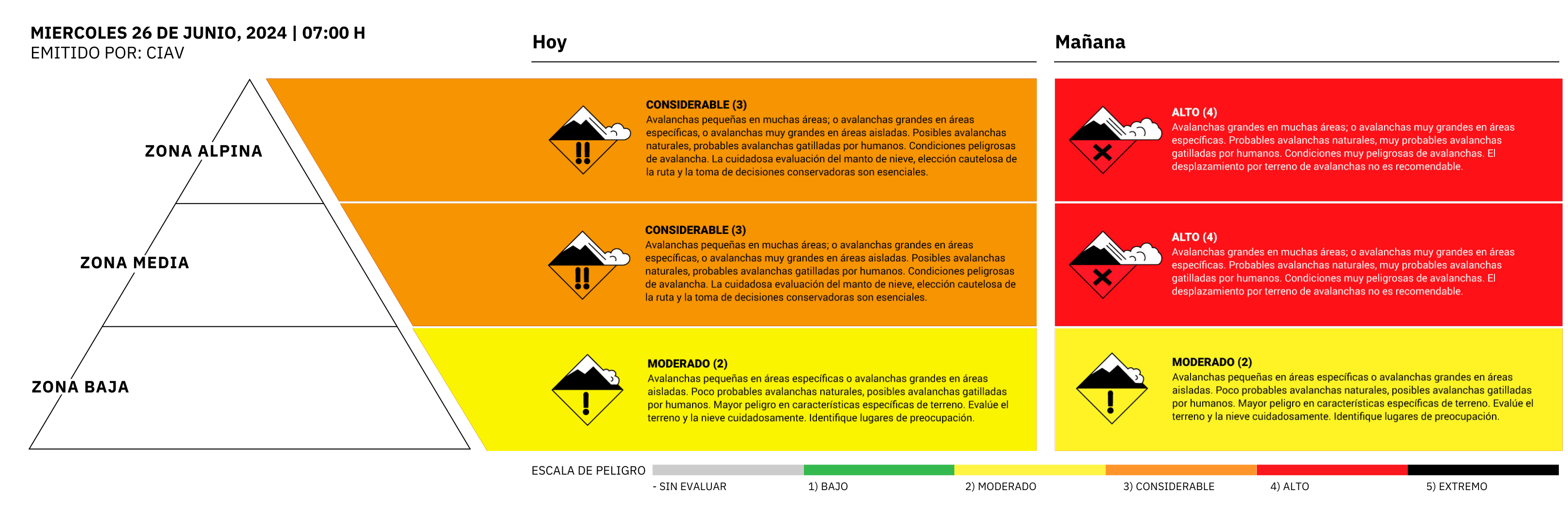 Para el día de mañana, jueves 27, se estima que el peligro de avalanchas aumente. La confianza en esta estimación para mañana se considera baja.