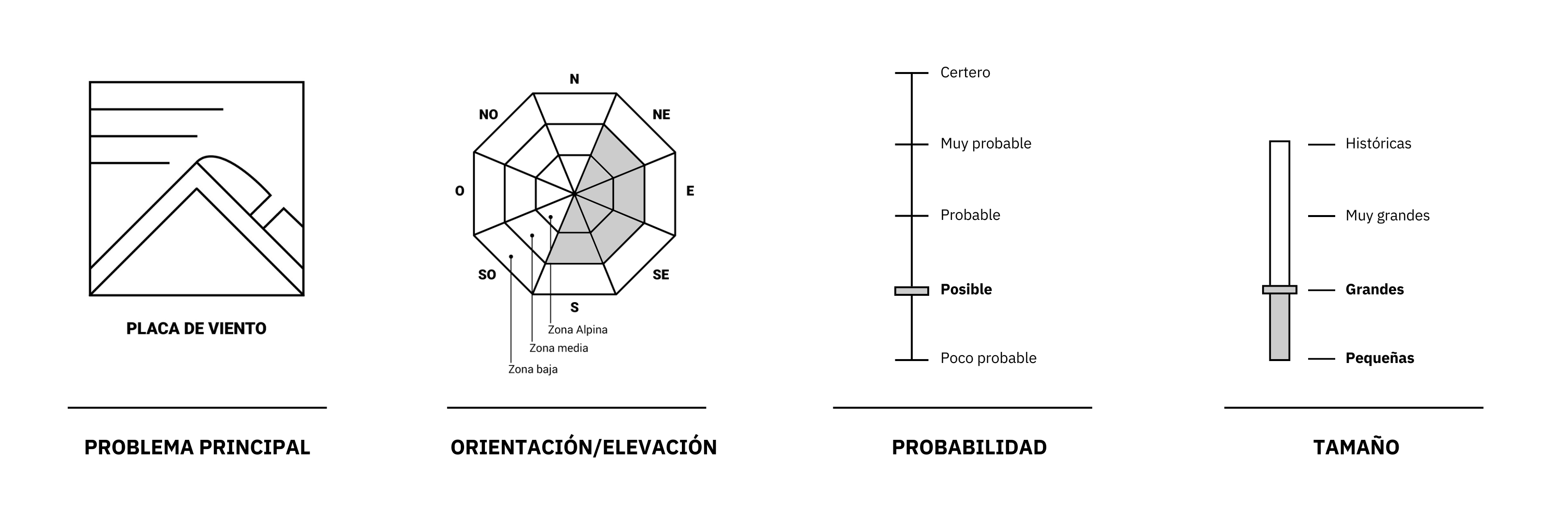 Prestar atención a las pendientes muy pronunciadas y extremas con acumulaciones recientes producidas por la precipitación y el viento, cercanas a los filos u obstáculos que propicien la acumulación, si estas superan los 25 cm a 30 cm y sobre todo si presentan trampas de terreno como áreas confinadas, arroyos, depresiones, acantilados, etc. Se recomienda tener especial precaución en la zona alpina y zona media en pendientes que superen los 35º, y en orientaciones noreste, este, sureste y sur.