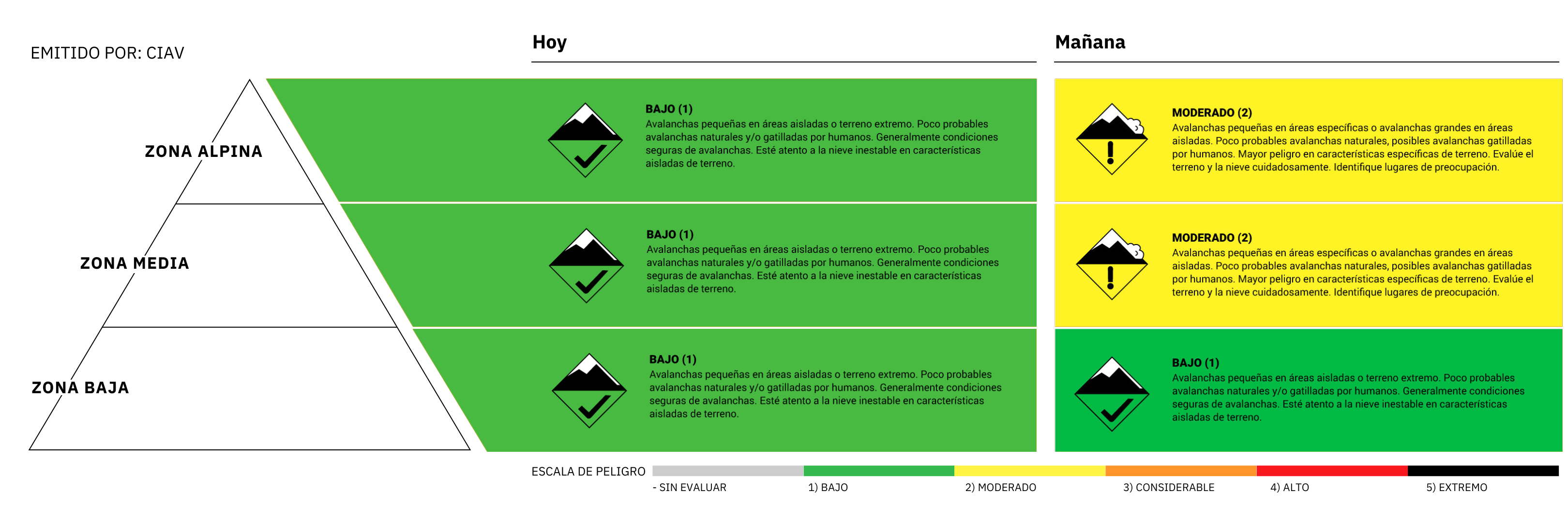Para el día de mañana, domingo 18, se estima que el peligro de avalanchas en zona Alpina y zona Media sea Moderado (2) y en zona Baja sea Bajo (1). La confianza en esta estimación para mañana se considera baja.