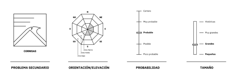 Probables avalanchas grandes de placa de viento en las orientaciones suroeste, sur, sureste, este y noreste de la zona Alpina. Probables avalanchas chicas y posibles avalanchas grandes de placa de viento en las orientaciones suroeste, sur, sureste, este y noreste de la zona Media. Posibles avalanchas chicas de nieve suelta húmeda en todas las orientaciones de la zona baja. Probable caída de cornisas.
