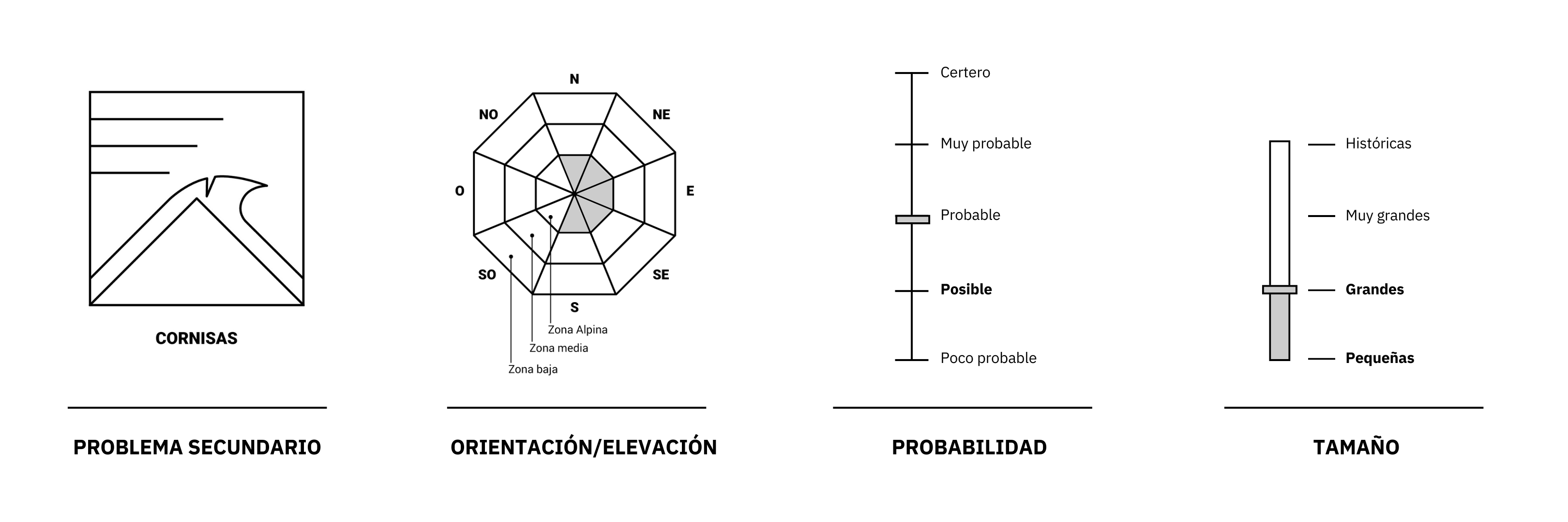 Probables avalanchas de placas de viento grandes particularmente en zona alpina, con menor probabilidad en zona media, en lugares específicos a sotavento de filos, lomos y otros obstáculos, especialmente en orientaciones noreste, este, y sur.