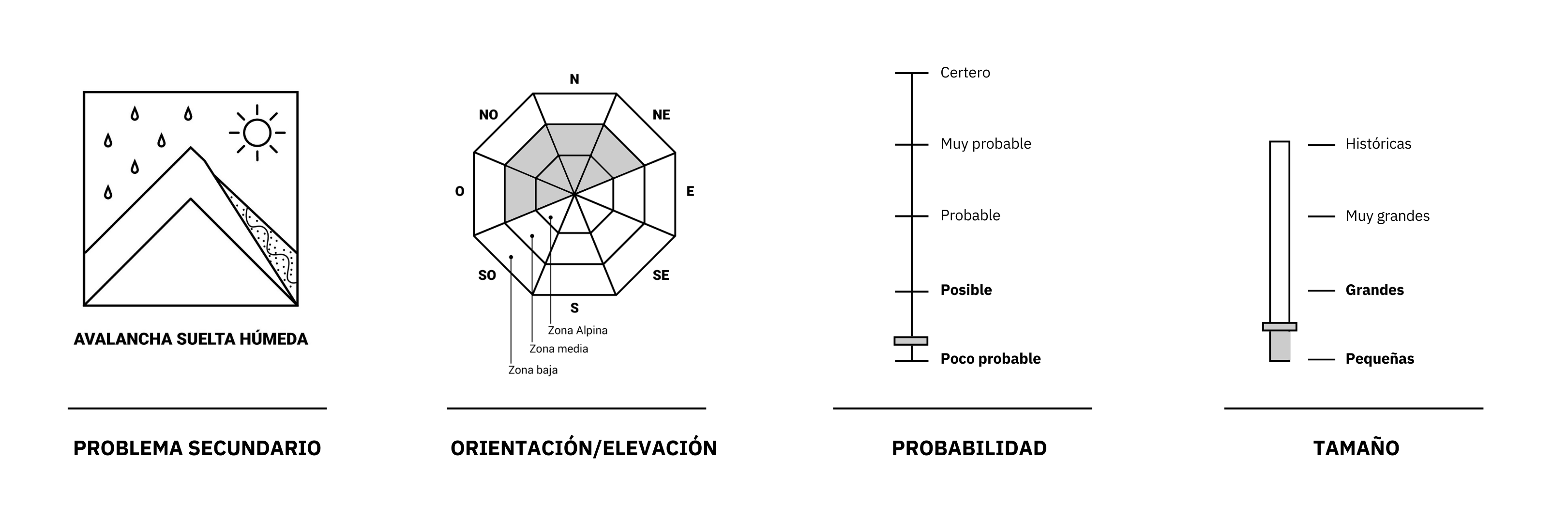 Poco probable avalanchas pequeñas de Placa de Viento en la zona Alpina en orientaciones este, sureste y sur. Poco probable avalanchas de nieve suelta húmeda en zona Alpina y Zona media en orientaciones noreste, norte, noroeste y oeste. Posible caídas de Cornisas en zona Alpina y zona Media. Poco probable avalanchas en zona Baja.