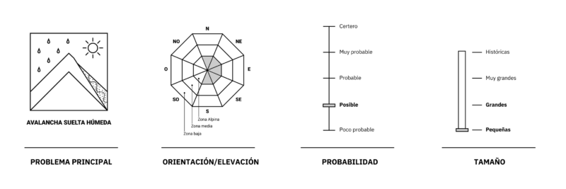 Posibles avalanchas chicas de nieve suelta húmeda en las orientaciones sur, sureste, este, noreste y norte de la zona alpina. Poco probables avalanchas en la zona media y en la zona baja.