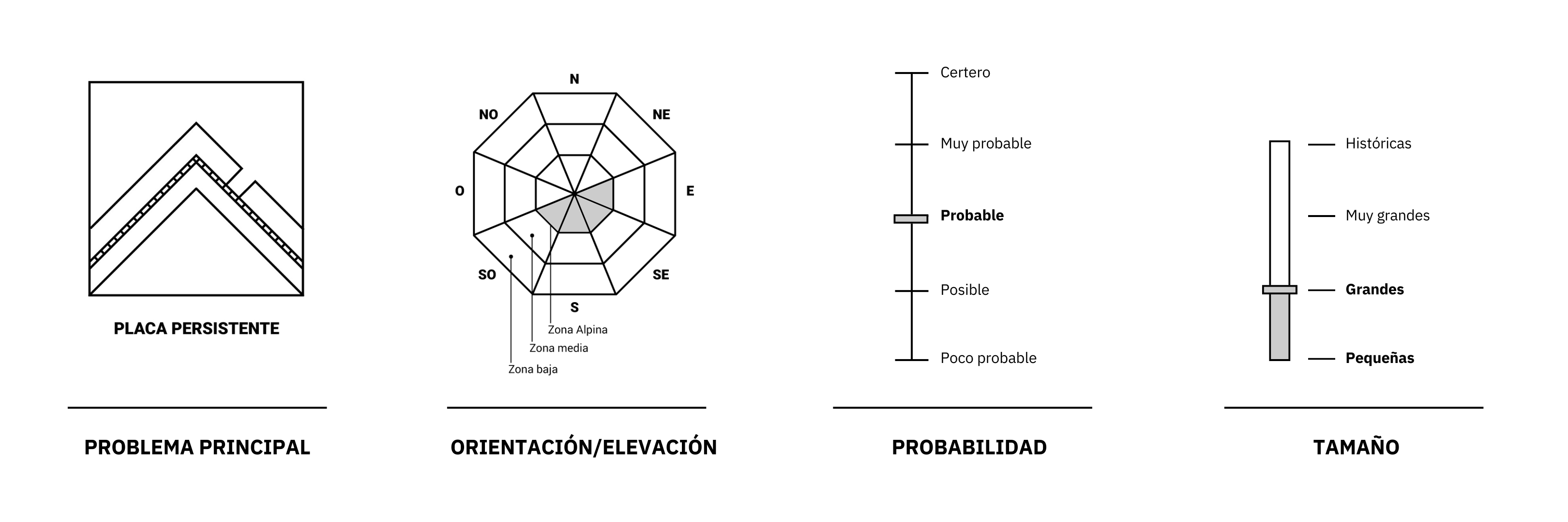 Probables avalanchas pequeñas y posibles avalanchas grandes de Placa Persistente, en la zona Alpina, en orientaciones sur, sureste, suroeste y este. Posibles avalanchas pequeñas en zona Media. Poco probable avalanchas en zona Baja.