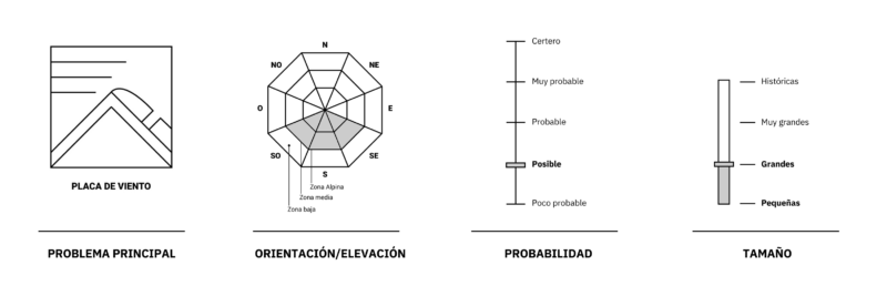 Evitar transitar en pendientes muy pronunciadas, mayores o iguales a 35 grados de inclinación, cerca de los filos y de los obstáculos en la zona alta y media de la montaña, en las orientaciones descriptas en problemas de avalanchas, en lugares con nuevas acumulaciones producidas por las precipitaciones y el viento. Evitar lugares que presenten trampas de terreno, como rocas todavía descubiertas, zonas confinadas y barrancos, donde incluso una avalancha pequeña podría tener consecuencias graves.