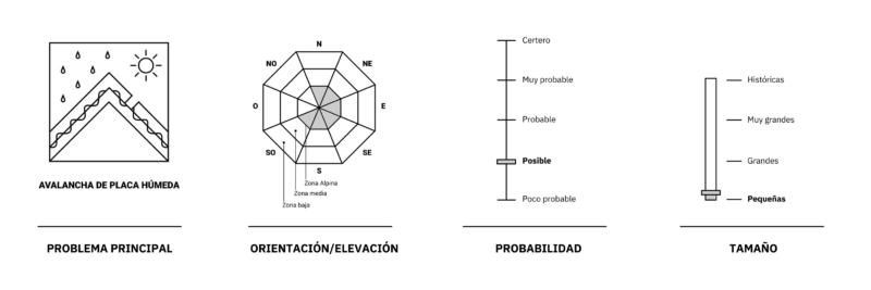 Posibles avalanchas chicas de placa húmeda en las orientaciones suroeste, sur, sureste, este, noreste y norte de la zona alpina. Posibles avalanchas de nieve suelta húmeda en la zona media. La zona baja está sin nieve suficiente para la ocurrencia de avalanchas.
