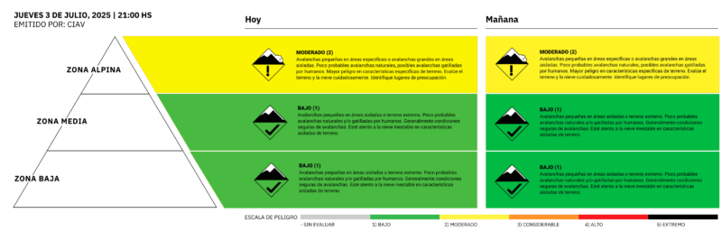 Prestar especial atención a las acumulaciones en pendientes superiores a 35°, en zona media y principalmente en sector alpino, donde podrían encontrarse espesores críticos debido a la última nevada y el transporte por viento.