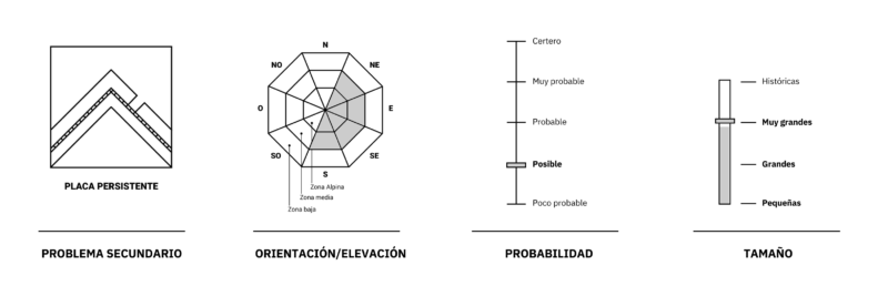Probables avalanchas chicas y grandes, de Placa de Viento, en orientaciones noreste, este, sureste, sur y de carga cruzada de la zona Alpina y la zona media. Probable caída de Cornisas medianas y grandes en zona Alpina y zona media. Posibles avalanchas muy grandes de placa persistente en zona alpina y zona media, en orientaciones sur, sureste, este y noreste. Posibles avalanchas chicas y grandes en zona Baja.