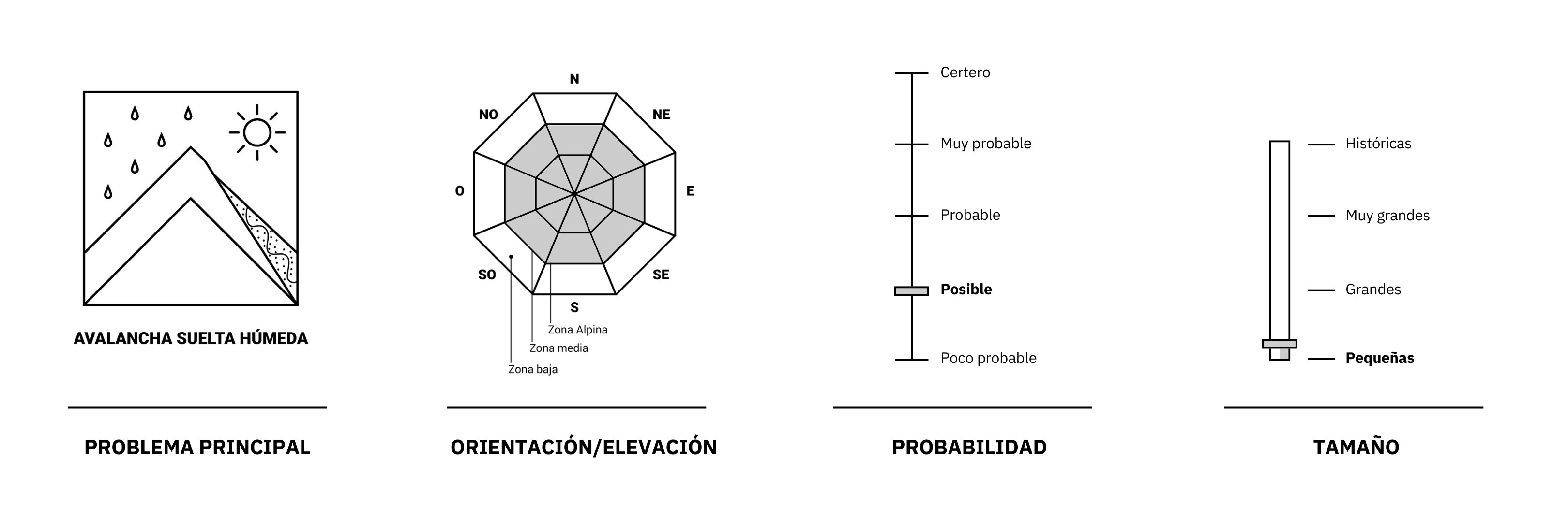 Posible avalanchas pequeñas de nieve suelta húmeda en todas las orientaciones de la zona Alpina y zona Media. Poco probable avalanchas en la zona Baja.