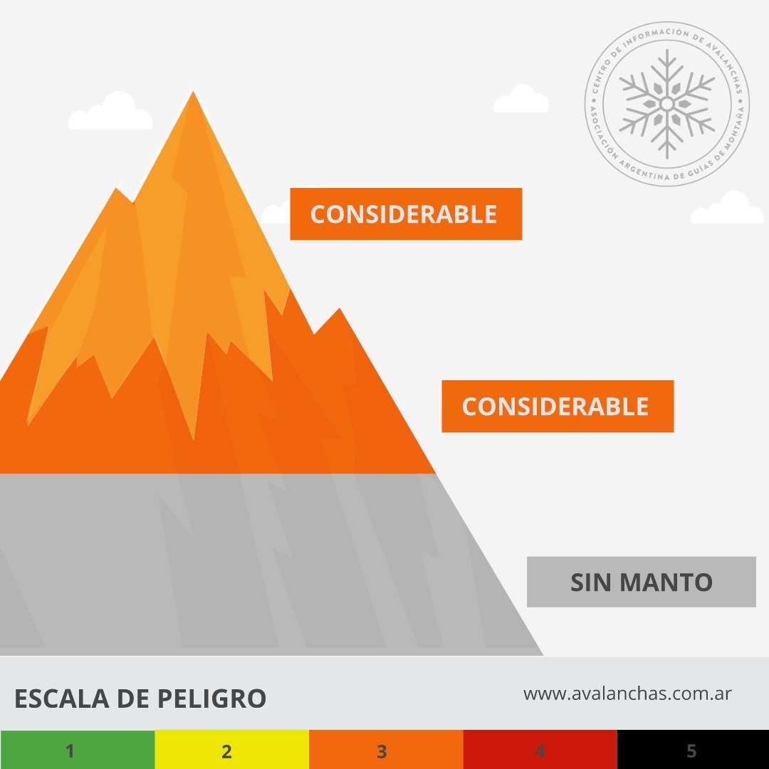 Nivel de peligro: Zona Alpina 3 (considerable), Zona Media 3: (considerable), Zona Baja: sin manto.